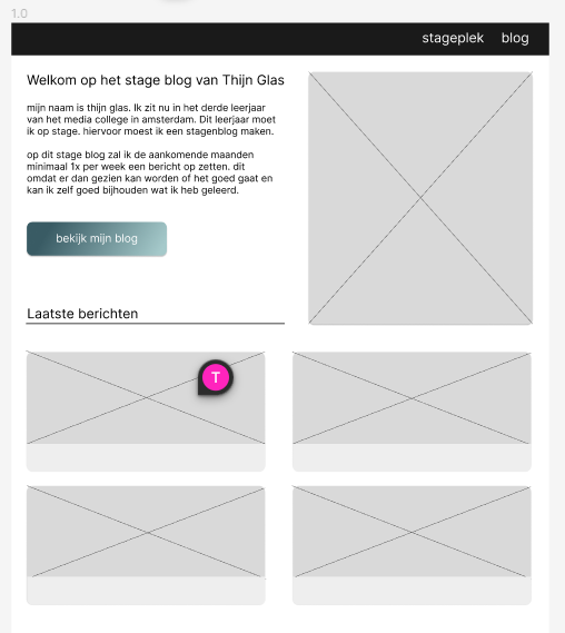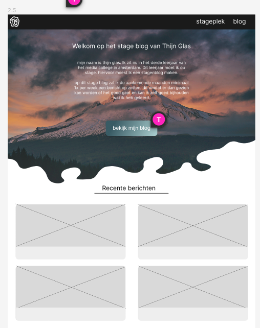 Dit is de stageblog pagina geworden. Het idee van uitgelicht bericht vond ik fijn zodat ik als ik trots was op een project die boven aan de pagina kan zetten. verder heb ik ook een filter optie toegevoegd zodat je de weekoverzicht filter aan kan zetten wanneer je alleen de weekoverzichten wil bekijken.