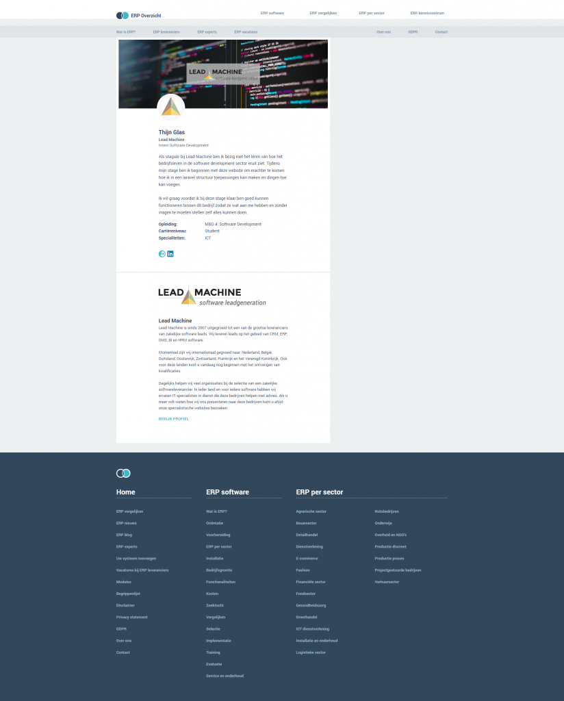 Ik heb meerdere dingen gedaan deze week. De eerste 2 dagen heb ik een erp-experts pagina gemaakt in een website van Lead Machine zodat ik met een leuke opdracht meteen leer hoe hun code structuur in elkaar zit. Deze website is in laravel gemaakt en hier heb ik nog niet zo veel mee gewerkt, dit vond ik dus een fijne opdracht om erachter te komen hoe deze code in elkaar zit.
