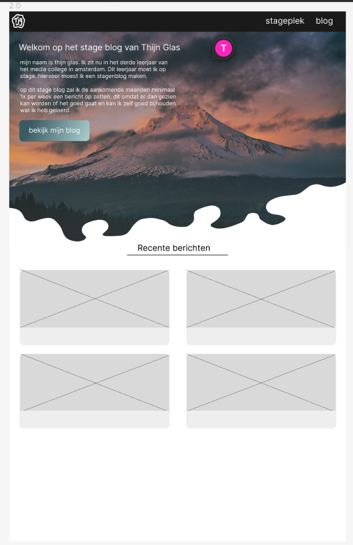 Dit is de stageblog pagina geworden. Het idee van uitgelicht bericht vond ik fijn zodat ik als ik trots was op een project die boven aan de pagina kan zetten. verder heb ik ook een filter optie toegevoegd zodat je de weekoverzicht filter aan kan zetten wanneer je alleen de weekoverzichten wil bekijken.