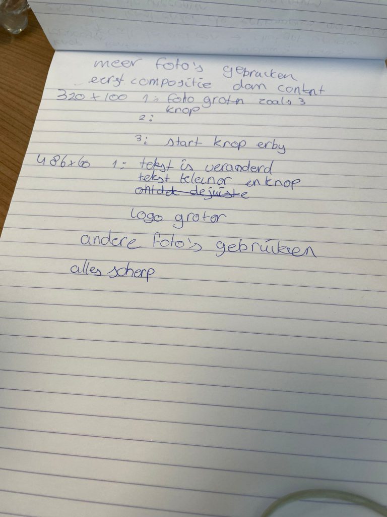 deze banners heb ik gepresenteerd aan mijn stagebegeleider en de jongens van het Nederlandse gedeelte van Lead Machine. Hier heb ik ook feedback op gekregen en daar ga ik nu aanpassingen op maken. Zie hieronder de feedback: